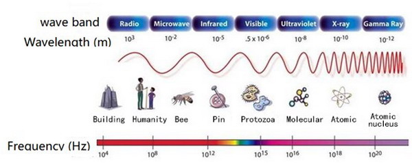 Både infraröd strålning och mikrovågsugn tillhör elektromagnetiska vågor. Det elektromagnetiska spektrumet för elektromagnetiska vågor varierade i storleksordningen våglängd eller frekvens och energi visas i figuren enligt nedan:
